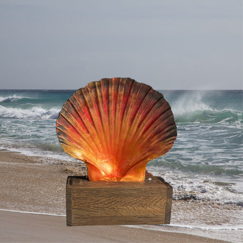 Handgefertigte Natur-Skulptur 201 – rot-schwarz kolorierte Muschel auf Holzsockel
